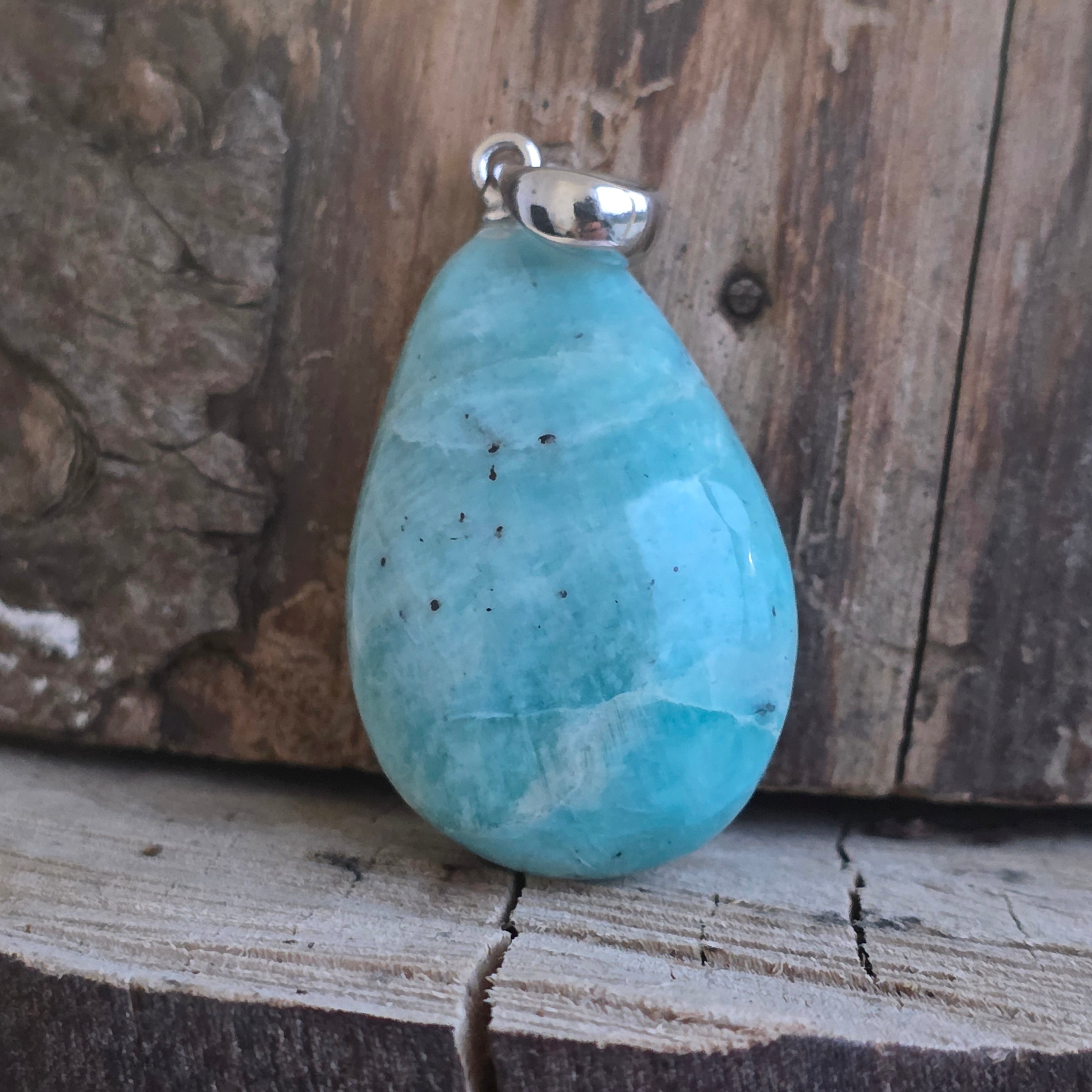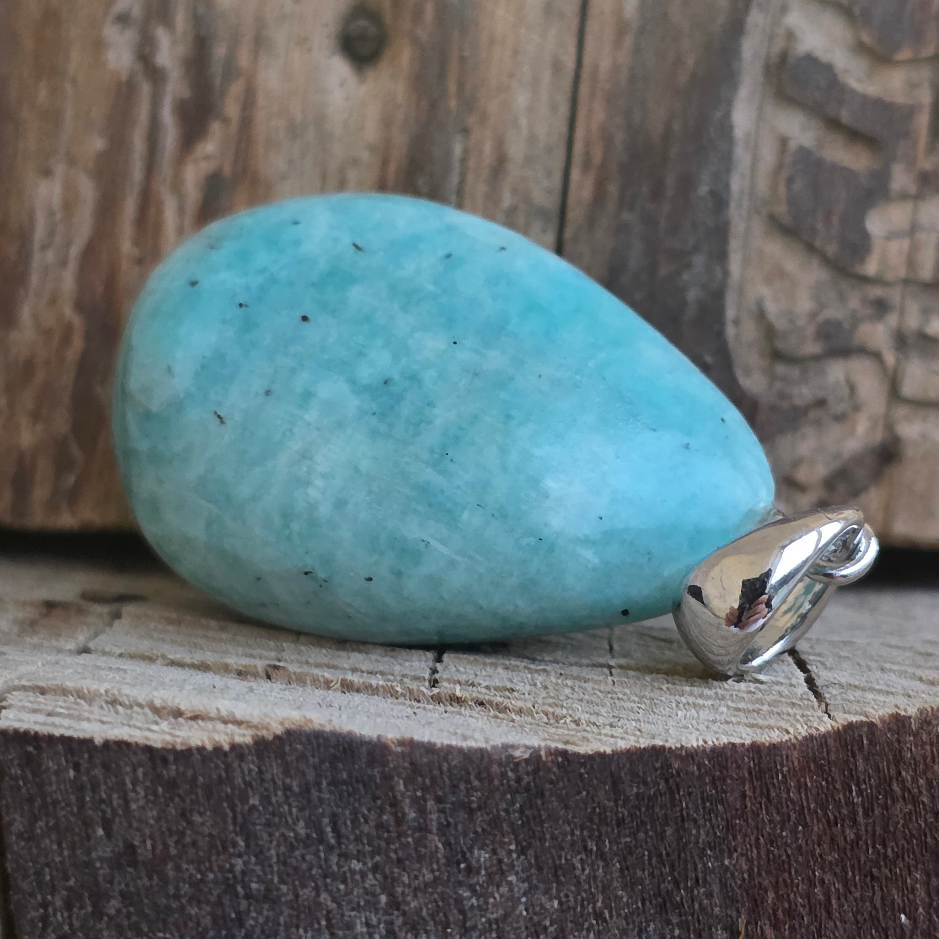 Ten Wisiorek z kaboszonem Amazonit Podkreśla delikatne odcienie zieleni i błękitu kamienia, kojarzące się z wewnętrznym spokojem i równowagą emocjonalną. Każdy egzemplarz jest wyjątkowy, dzięki naturalnym różnicom w kolorze i fakturze, co sprawia, że ten wisiorek jest naprawdę wyjątkową biżuterią.