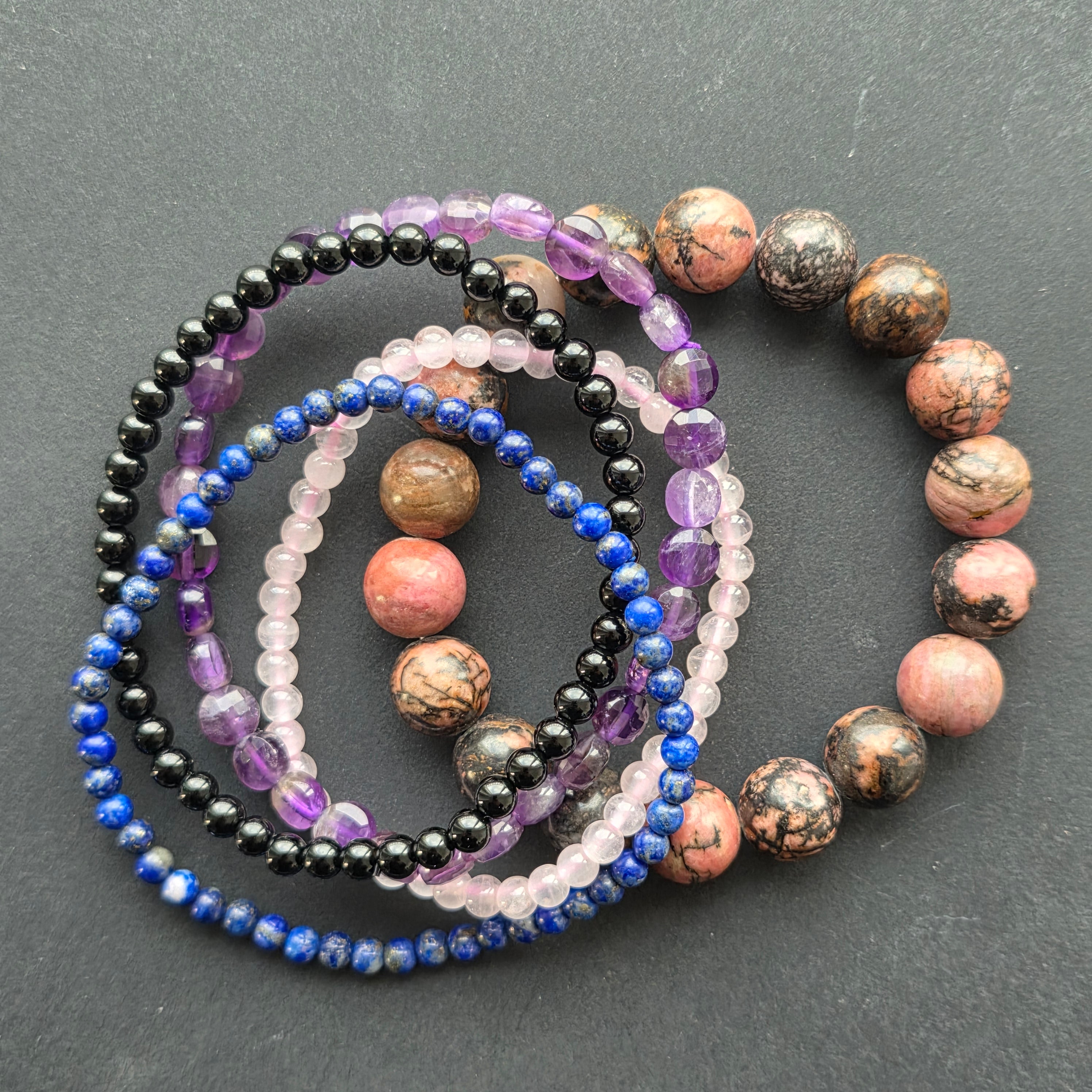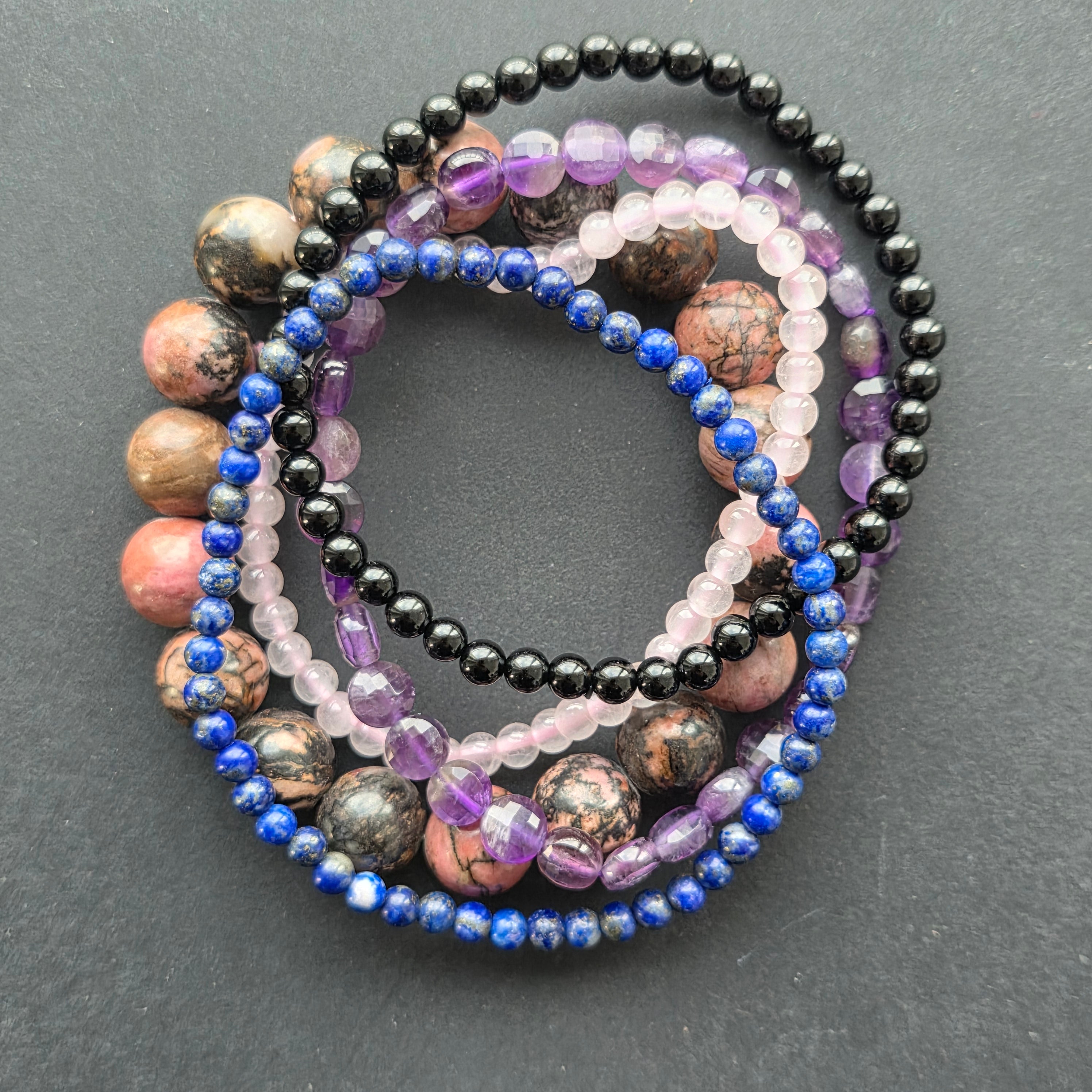 Rodonit o wielkości 10 mm jest emocjonalnym centrum zestawu — kamień równowagi uczuciowej, wewnętrznego uzdrowienia i dojrzałej współczucia, w harmonii z lojalną i troskliwą naturą kobiety Byka.